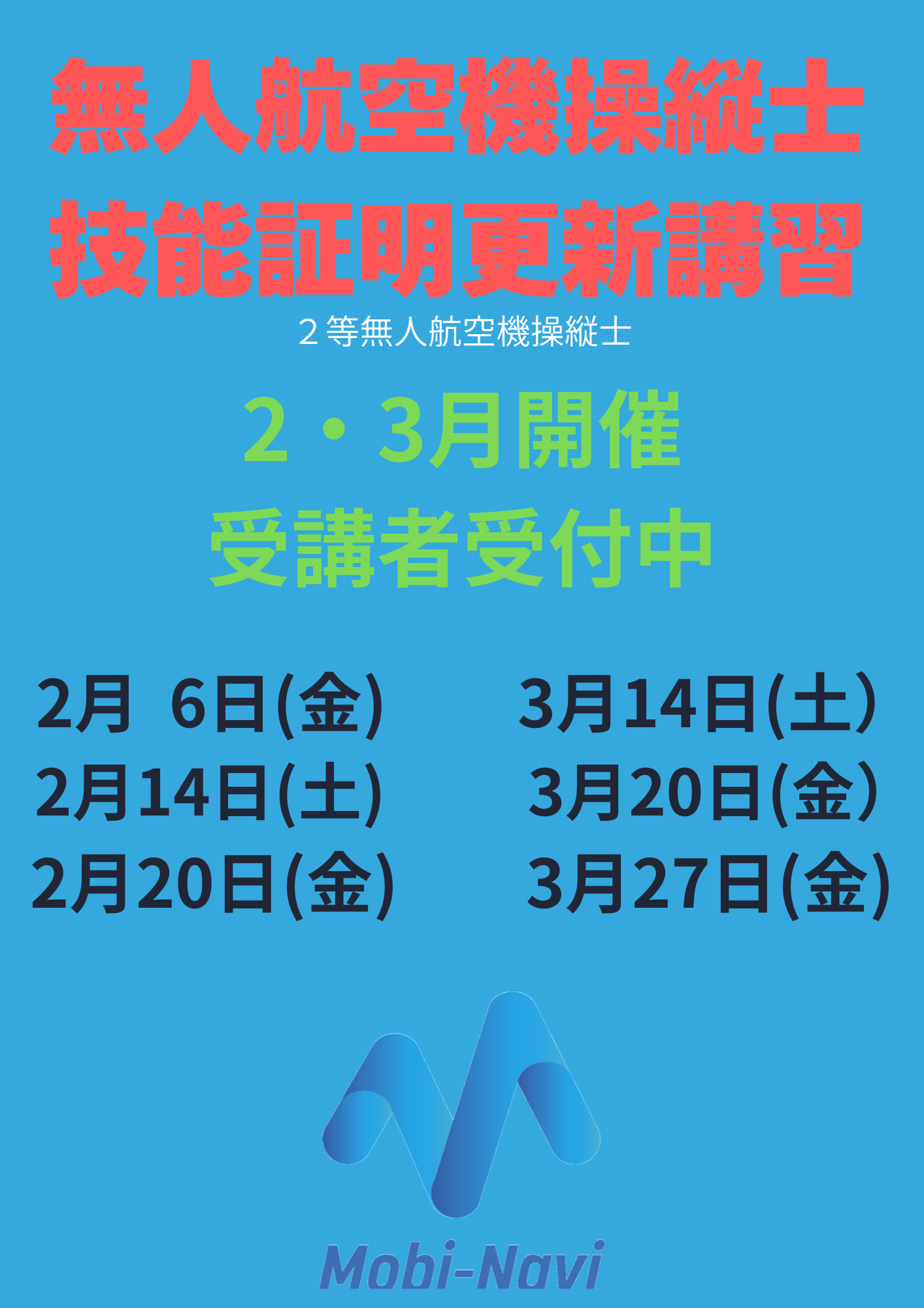 2026年1月4日 お知らせ国家資格 2026年2・3月度更新講習受付中!! モビリティナビ/MobiNaviDOMEでは、只今2・3月の更新講習の受講者の受付を行ってます。技能証明の有効期限の9か月前から受講可能ですが、更新期間(6か月)にならないと更新手続きに移行できませんので、注意してください。 更新講習の開催時間等の詳細についてモビナビドローンスクール事務局までお問い合わせください。 PREV BACK TO LIST 最新記事 2026.01.04 2026年2・3月度更新講習受付中!! 2026.01.01 新年あけましておめでとうございます。 2025.12.21 ドローン国家資格は実務直結型!! 2025.12.13 ハンドヘルド型レーザースキャナーの納品講習 2025.11.27 2026年1月度更新講習の開催日決定!! ブログカテゴリー リリース お知らせ アーカイブ スタッフブログ 製品の紹介 スクール準備 ドーム準備 国家資格 インストラクターのつぶやき 月別アーカイブ --選択ください-- 2026年1月 2025年12月 2025年11月 2025年10月 2025年9月 2025年8月 2025年7月 2025年6月 2025年5月 2025年4月 2025年3月 2025年2月 2025年1月 2024年12月 2024年11月 2024年10月 2024年9月 2024年8月 2024年7月 2024年6月 2024年5月 2024年4月 2024年3月 2024年2月 2024年1月 2023年12月 2023年10月 2023年9月 2023年8月 2023年7月 2023年6月 2023年5月 2023年4月 2023年1月 2022年12月