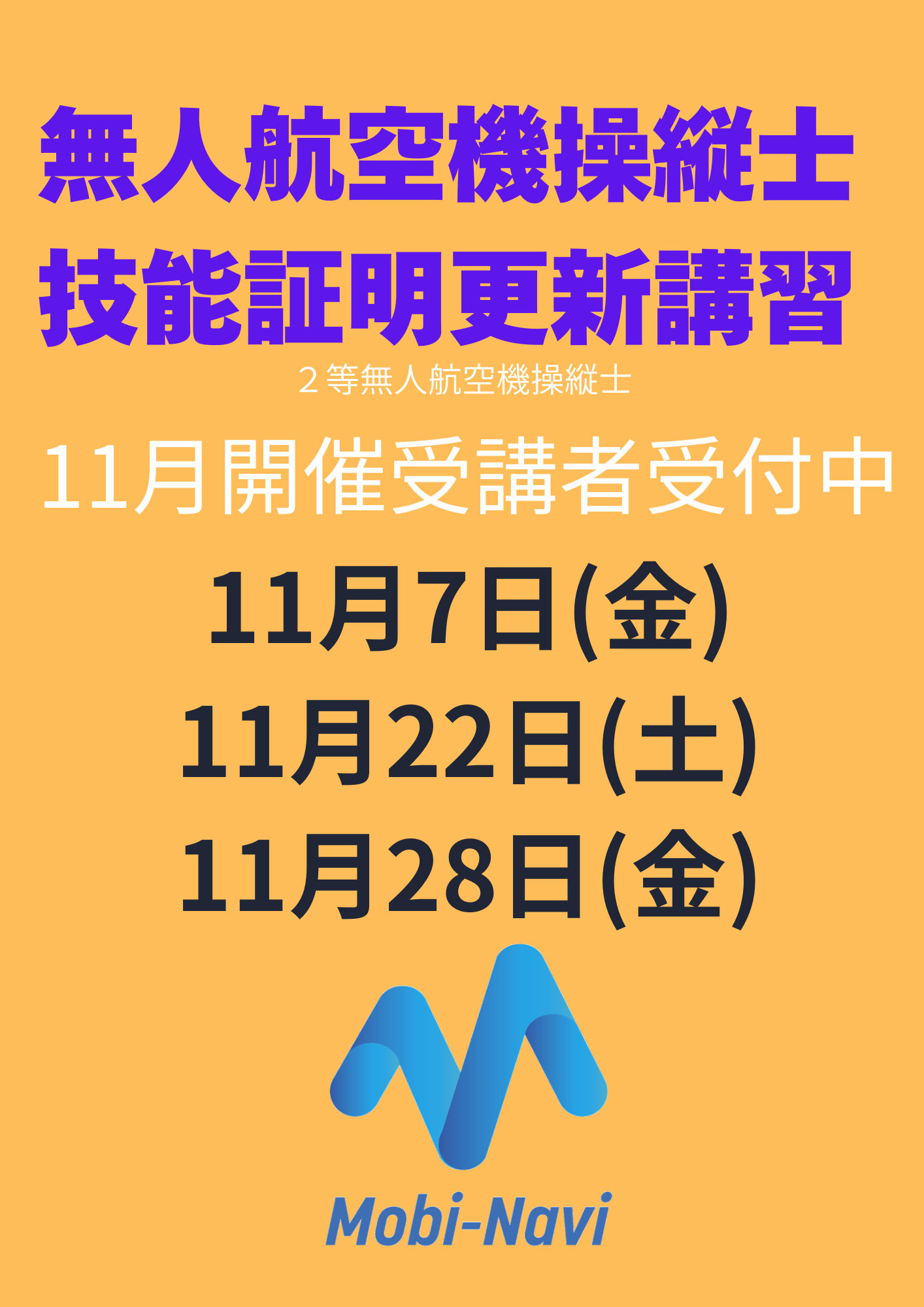 2025年10月10日 お知らせ国家資格 11月度更新講習の開催日決定!! モビリティナビ/MobiNaviDOMEでは、只今11月の更新講習の受講者の受付を行ってます。技能証明の有効期限の9か月前から受講可能ですが、更新期間(6か月)にならないと更新手続きに移行できませんので、注意してください。 更新講習の開催時間等の詳細についてモビナビドローンスクール事務局までお問い合わせください。 PREV BACK TO LIST NEXT 最新記事 2025.10.11 ドローン操縦の出張講習開催しました!! 2025.10.10 11月度更新講習の開催日決定!! 2025.09.25 9月29日~10月3日のMobiNaviDOME 2025.09.23 10月開催更新講習受付中!! 2025.09.19 第4回ドローンサミットに出展します!! ブログカテゴリー リリース お知らせ アーカイブ スタッフブログ 製品の紹介 スクール準備 ドーム準備 国家資格 インストラクターのつぶやき 月別アーカイブ --選択ください-- 2025年10月 2025年9月 2025年8月 2025年7月 2025年6月 2025年5月 2025年4月 2025年3月 2025年2月 2025年1月 2024年12月 2024年11月 2024年10月 2024年9月 2024年8月 2024年7月 2024年6月 2024年5月 2024年4月 2024年3月 2024年2月 2024年1月 2023年12月 2023年10月 2023年9月 2023年8月 2023年7月 2023年6月 2023年5月 2023年4月 2023年1月 2022年12月